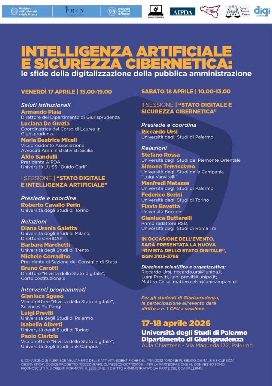 Venerdì 17 aprile, dalle ore 15:00 alle ore 19:00, e sabato 18 aprile, dalle ore 10:00 alle ore 13:00, presso il Dipartimento di Giurisprudenza dell’Università degli studi di Palermo, si terrà il convegno dedicato al tema “INTELLIGENZA ARTIFICIALE E SICUREZZA CIBERNETICA: le sfide della digitalizzazione della pubblica amministrazione“.